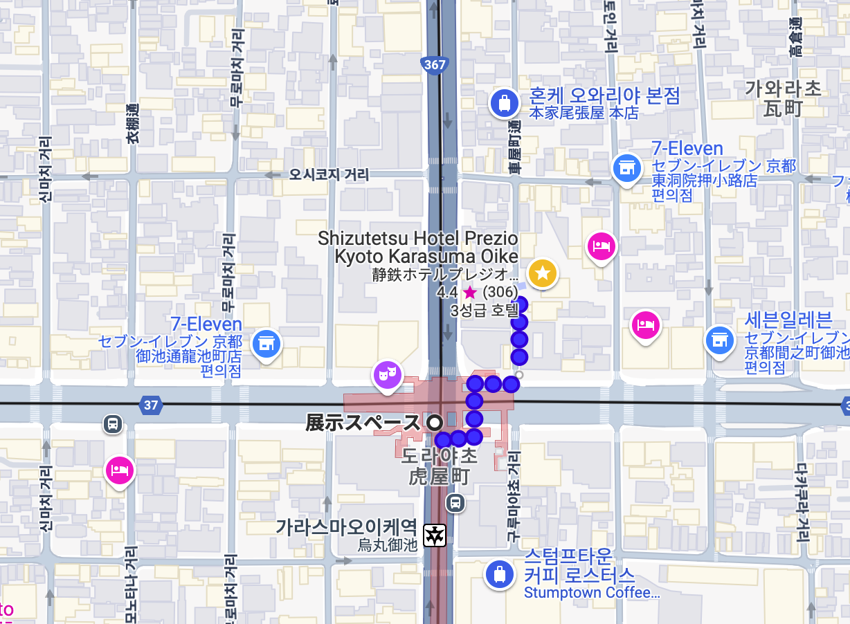 가라스마오이케역(Karasuma Oike Station)에서 걸어서 5분 거리고 안되는 곳이여서 무거운 케리어가 있는 여행객으론 최적의 위치였다. 지하철에 에스컬레이터가 없어서 계단으로 무거운 케리어를 들고 올라가야했지만, 지상으로 올라가 몸만 꺽으면 나오는 호텔의 위치에 감격했다.